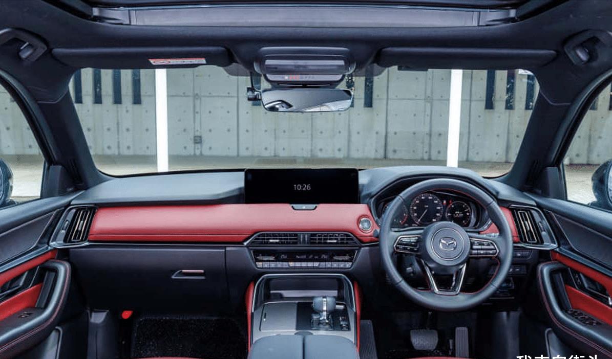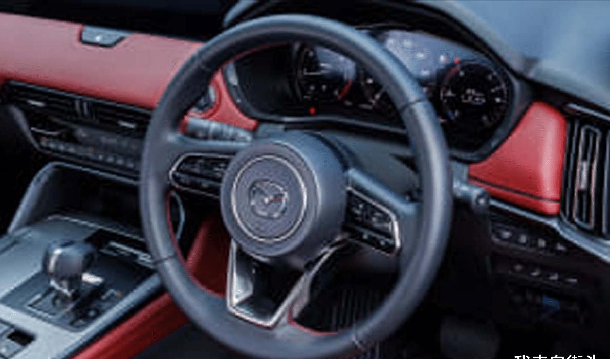 内饰部分,这次新增的Burgundy红色Nappa皮革套件,可以说是整台车最有“情绪价值”的地方。红色缝线贯穿方向盘与门板,加上金属饰件点缀,让CX-60在豪华与运动之间找到一个不错的平衡点。12.3寸全液晶仪表依旧是全车系标配,科技感维持在线。